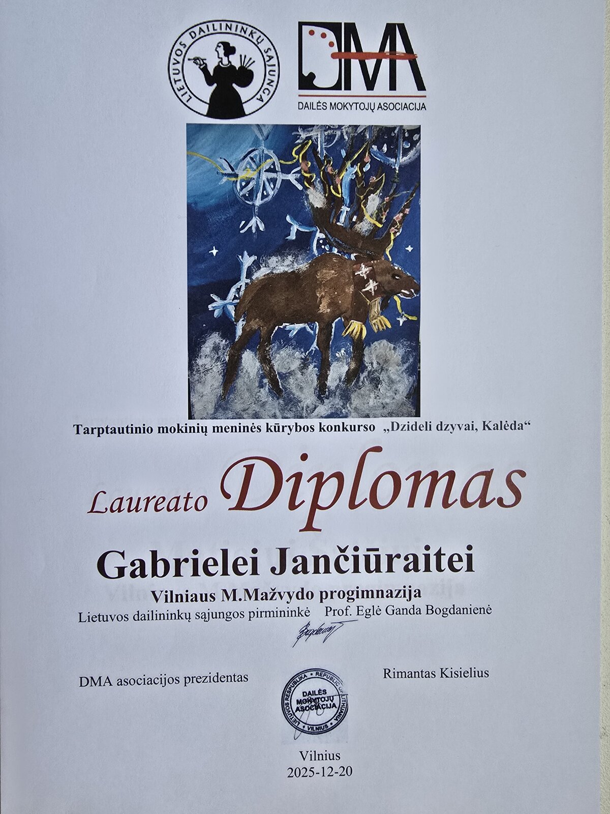 Didžiuojamės Gabrielės Jančiūraitės (5 d kl.), Kristijono Naujalio (6 d kl.), Majos Zybailos (6 d kl.) ir Matijaus Šalčio (6 d kl.) kūrybiškumu, darbštumu bei gebėjimu originaliai perteikti šventinę nuotaiką. Jų darbai atspindi ne tik meninius gebėjimus, bet ir nuoširdų, jautrų požiūrį į kūrybą.