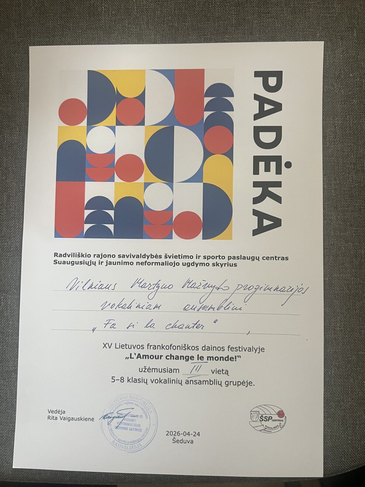 2026 m. balandžio 24 d. Šeduvoje vyko XV Lietuvos prancūziškos dainos festivalis „L’amour change le monde!“, subūręs talentingus mokinius iš įvairių Lietuvos mokyklų. Šiame renginyje puikiai pasirodė ir mūsų progimnazijos vokalinis ansamblis „Fa si la chanter“, atstovaujamas 7 pp klasės mokinių, kurie pelnė garbingą III vietą.