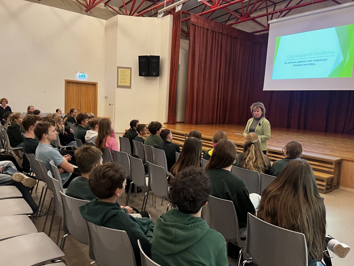 Direktorė kvietė mokinius pamąstyti: „Ką norėtum pakeisti savo mokykloje? Pasiūlyk savo idėją!“ Dalyvaujamasis biudžetas – tai būdas mokiniams kartu su mokytojais spręsti, kaip panaudoti skirtas lėšas, balsuojant už geriausias idėjas. Ši iniciatyva skatina atsakomybę, bendradarbiavimą ir kuria atviresnę sprendimų priėmimo kultūrą mokykloje.