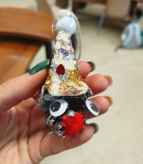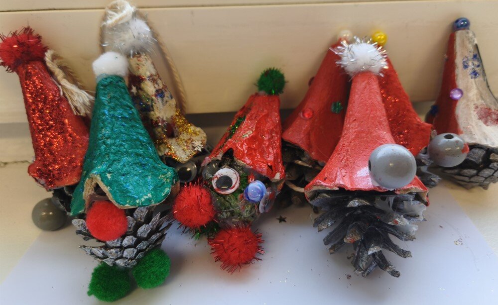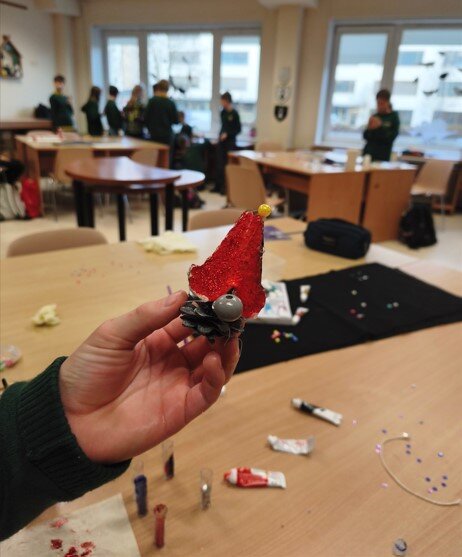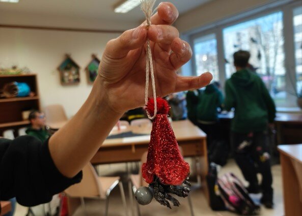 Klasėje tvyrojant kūrybiniam šurmuliui, kiekvienas mokinys susikūrė savitą nykštuką, kuriuo papuoš savo Kalėdų eglutę.