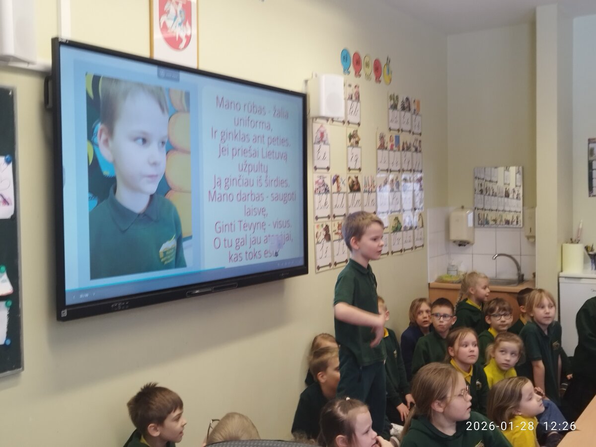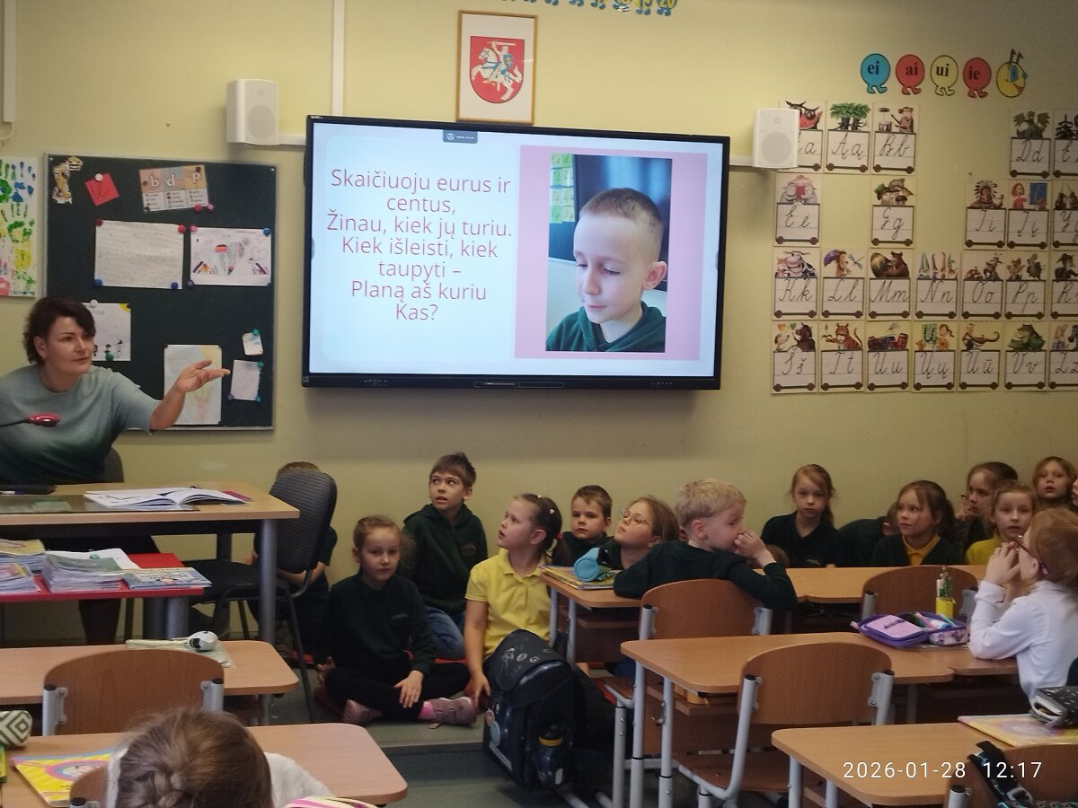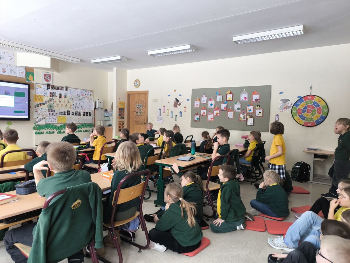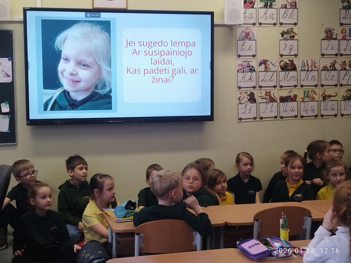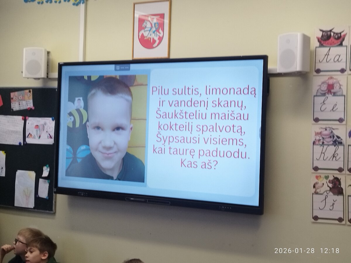 1D klasės mokiniai, padedami tėvelių, sukūrė mįsles apie įvairias profesijas, jas įgarsino ir pristatė 1A klasės mokiniams. Pastarieji turėjo atspėti kuo daugiau profesijų – jiems puikiai pavyko, nes buvo atspėtos beveik visos mįslės.