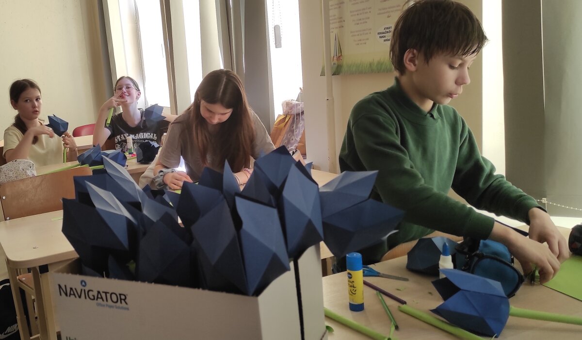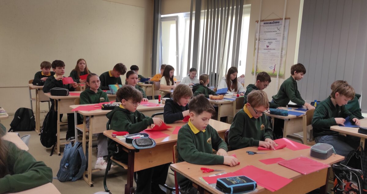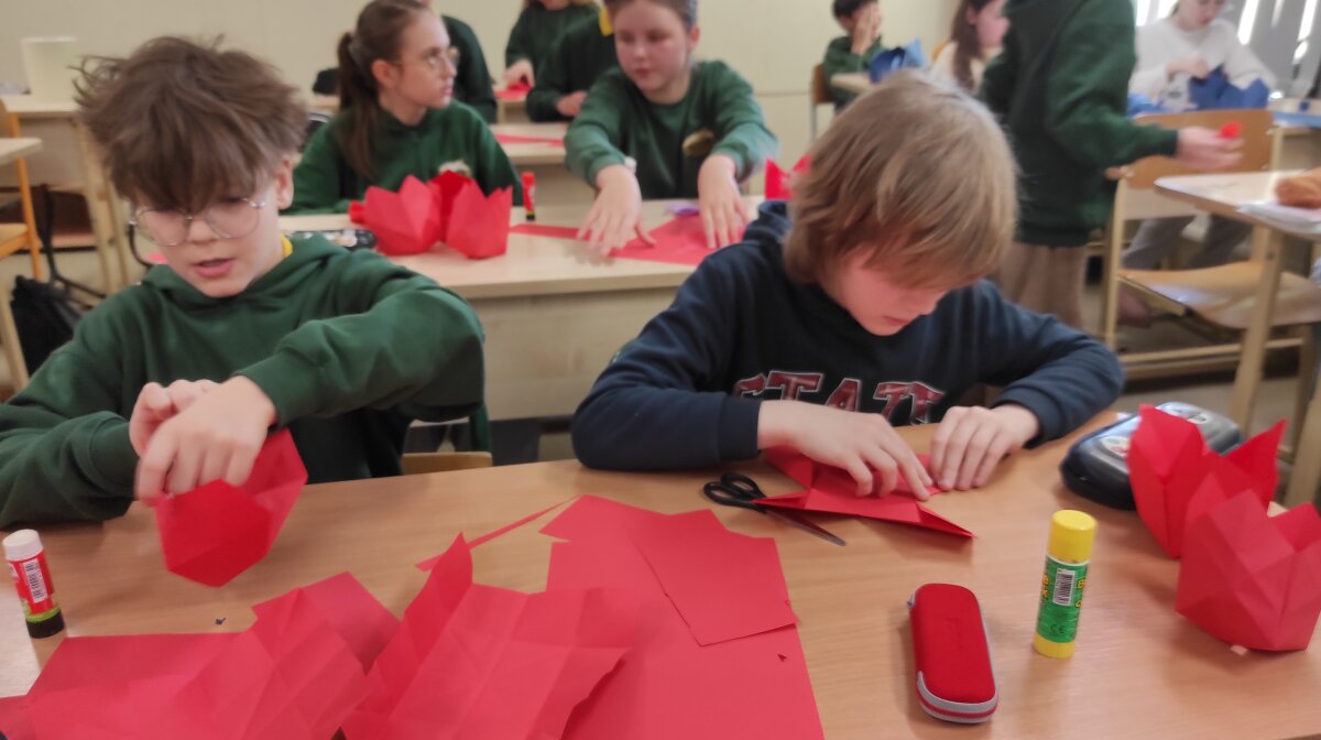 Visą savaitę 5 pp klasėje dūzgė kūrybinės dirbtuvės – penktokai pagamino daugiau nei 160 Prancūzijos vėliavos spalvų tulpių ketvirtokams.