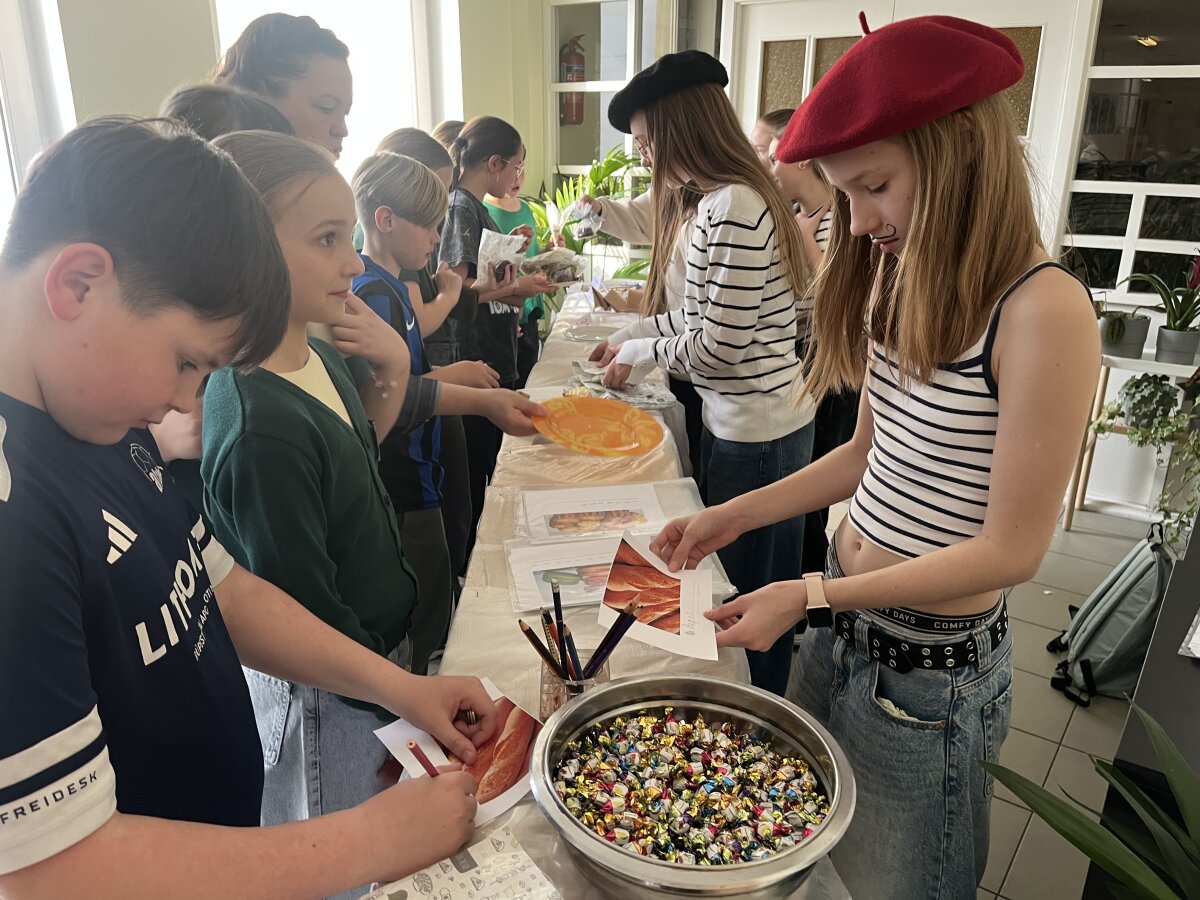 Prie saldumynų stalo laukė smagios užduotys – mokiniai bandė atpažinti ir įvardyti prancūziškus užkandžius bei saldumynus, o padedami mokytojų, jie drąsiai perskaitė pavadinimus.