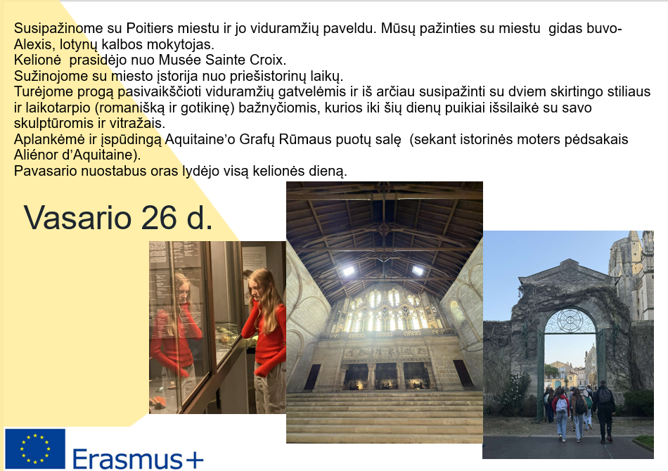 - Kultūrinės ekskursijos. Mokiniai lankėsi Poitiers mieste – istorijos ir architektūros kupinoje vietovėje, kur susipažino su miesto paveldu, siaurų gatvelių žavesiu ir gyva prancūziška atmosfera.