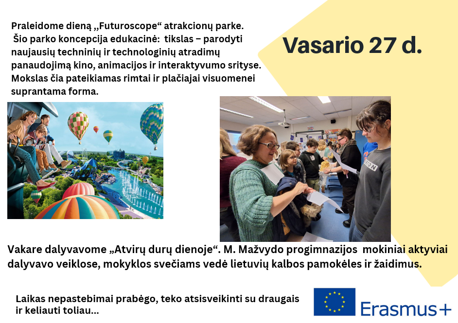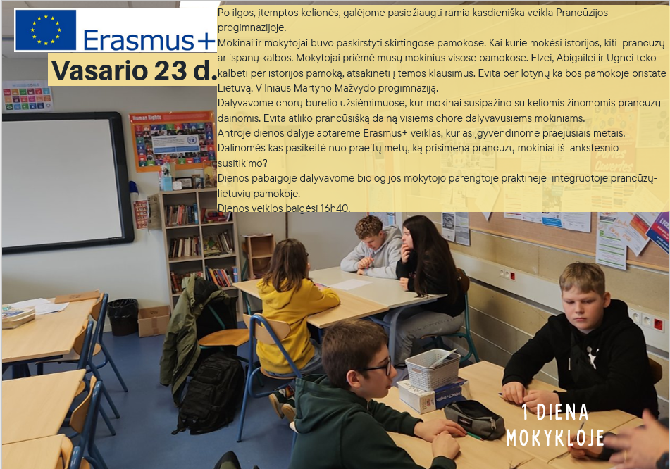 2026 m. kovo 23–28 dienomis Vilniaus Martyno Mažvydo progimnazijos bendruomenė gyveno ypatingomis nuotaikomis – net 9 mokiniai dalyvavo savaitę trukusiuose mokinių mainuose pagal „Erasmus+“ programą. Mokiniai vyko su biologijos mokytoja Vilma, tikybos mokytoju Justinu ir prancūzų kalbos mokytoju Pierre. Šios prasmingos kelionės tikslas – ne tik mokiniams tobulinti prancūzų kalbos įgūdžius, bet ir pažinti šalies kultūrą, kasdienį gyvenimą bei stiprinti tarpkultūrinį bendravimą.