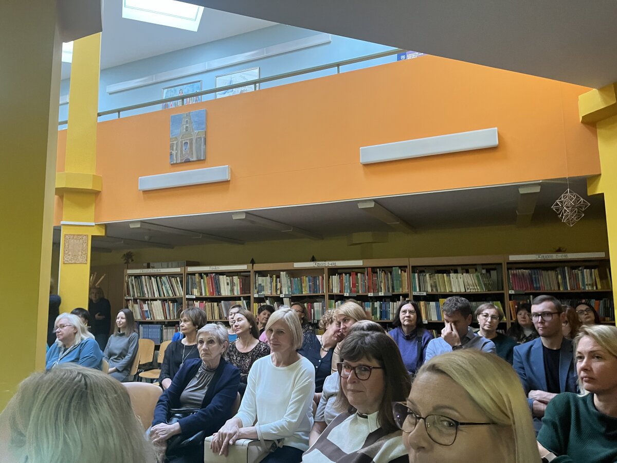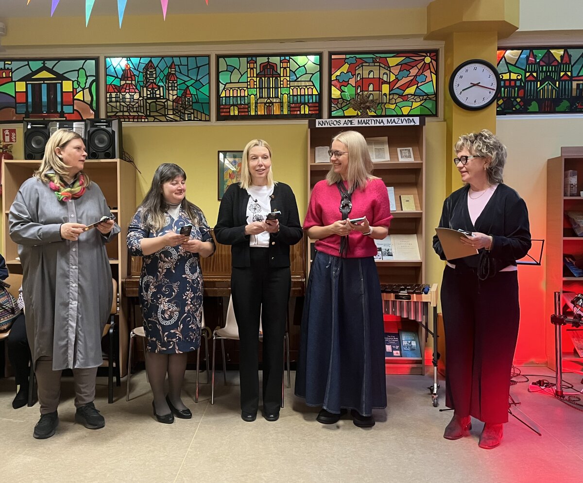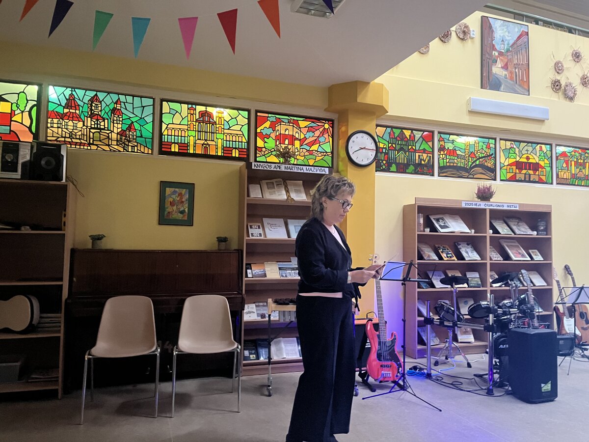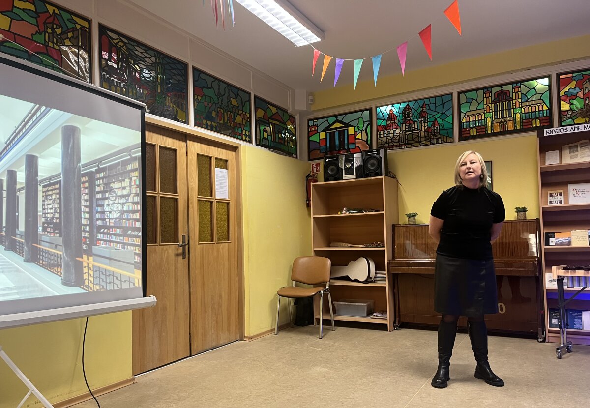 Svečiuose lankėsi bibliotekos generalinė direktorė Aušrinė Žilinskienė, kuri pasidžiaugė mokytojų kasdieniu indėliu ugdant mokinius ir pristatė bibliotekos galimybes. Pristatymą pradėjo nuo bibliotekoje esančios menininkės Jolitos Vaitkutės instaliacijos „Pabudę iš knygų“, kurioje iš knygų nugarėlių ir juodo popieriaus sukurtas M. K. Čiurlionio portretas. Šis kūrinys ne tik atspindi menininkės pagarbą knygai, bet ir atliepia tvarumo misiją, skatindamas pernaudojimą ir kūrybiškumą. Daugiau informacijos: Pabudę iš knygų | M.K. Čiurlionis.