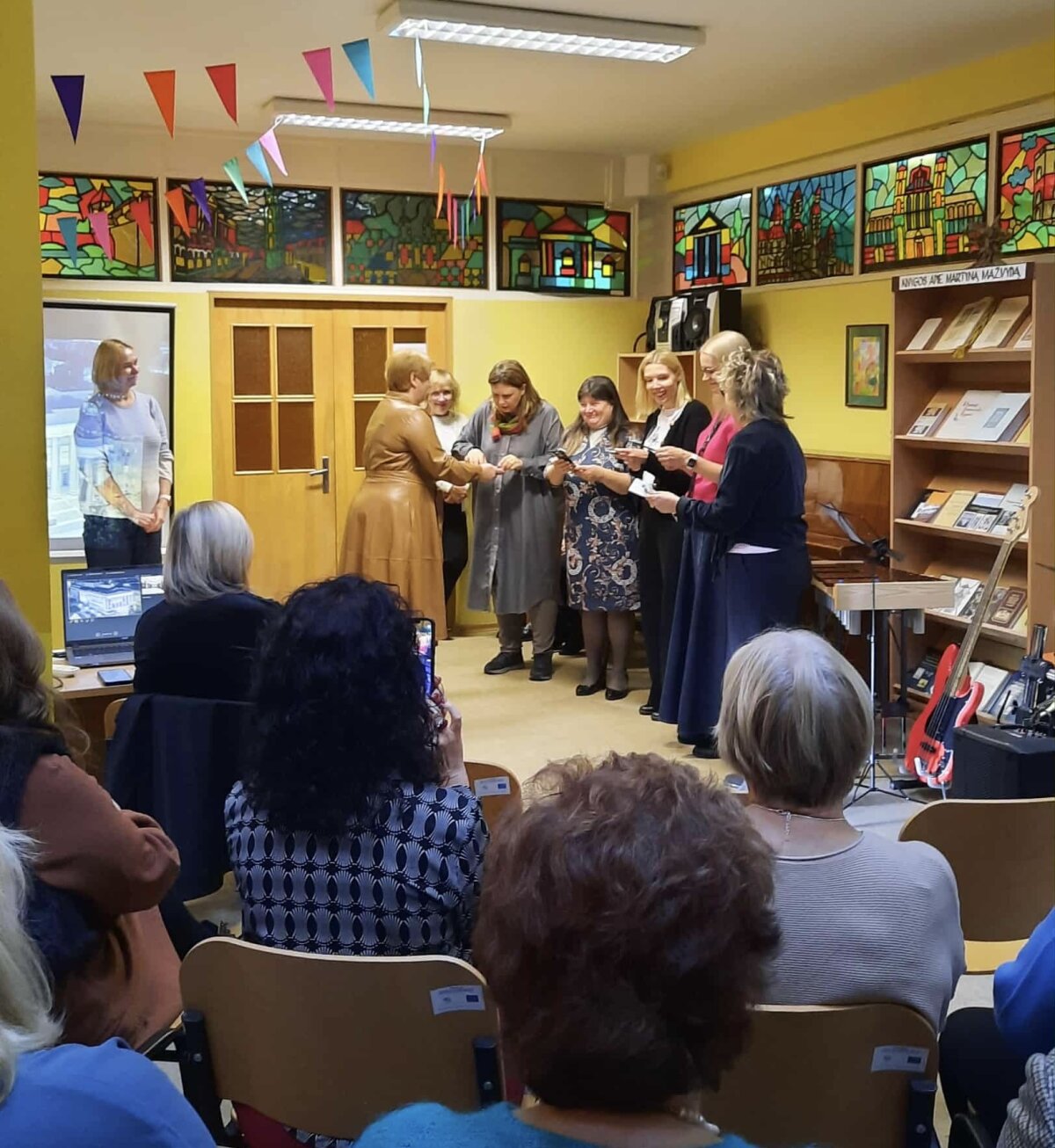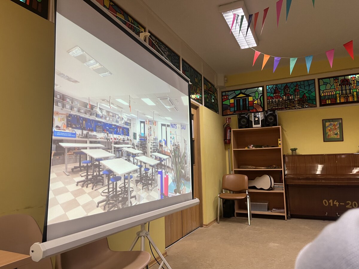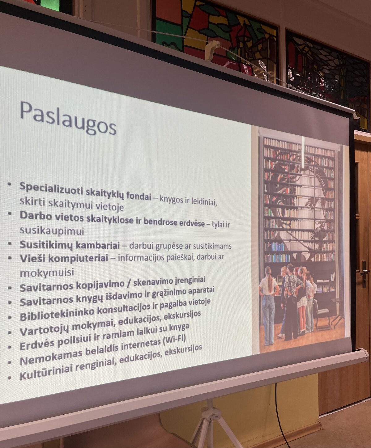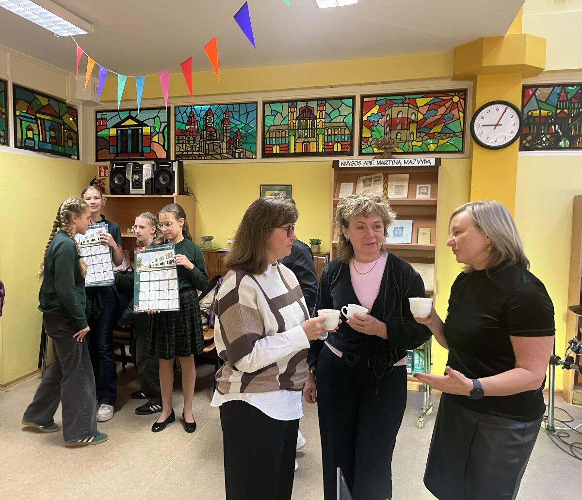 Svečiuose lankėsi bibliotekos generalinė direktorė Aušrinė Žilinskienė, kuri pasidžiaugė mokytojų kasdieniu indėliu ugdant mokinius ir pristatė bibliotekos galimybes. Pristatymą pradėjo nuo bibliotekoje esančios menininkės Jolitos Vaitkutės instaliacijos „Pabudę iš knygų“, kurioje iš knygų nugarėlių ir juodo popieriaus sukurtas M. K. Čiurlionio portretas. Šis kūrinys ne tik atspindi menininkės pagarbą knygai, bet ir atliepia tvarumo misiją, skatindamas pernaudojimą ir kūrybiškumą. Daugiau informacijos: Pabudę iš knygų | M.K. Čiurlionis.
