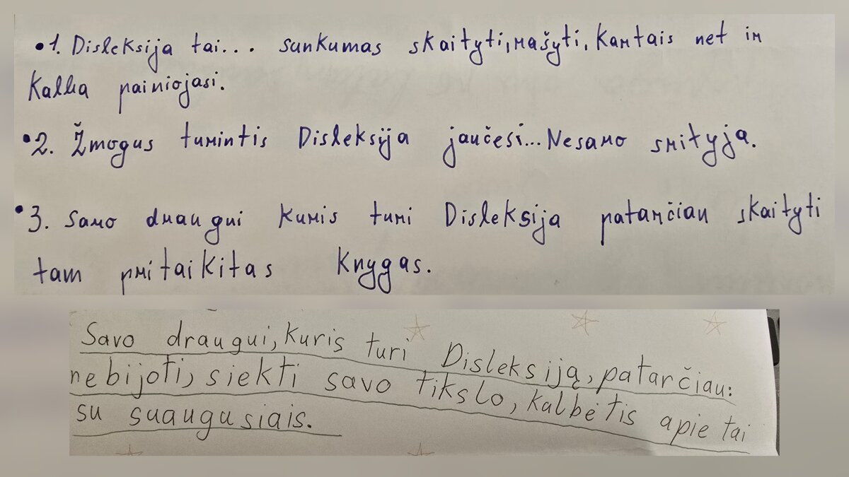 Mokiniai dalijosi, kad iki šiol apie disleksiją žinojo nedaug, todėl užsiėmimai buvo itin naudingi – jie padėjo suprasti, kad disleksija nėra kliūtis siekti tikslų, o tiesiog kitoks būdas mokytis. Daugelį įkvėpė žinia, jog disleksija nereiškia intelekto stokos ar nesėkmės – daugybė įžymių žmonių su disleksija išsiskiria kūrybiškumu, atkaklumu ir gebėjimu mąstyti „kitokiu“ būdu.