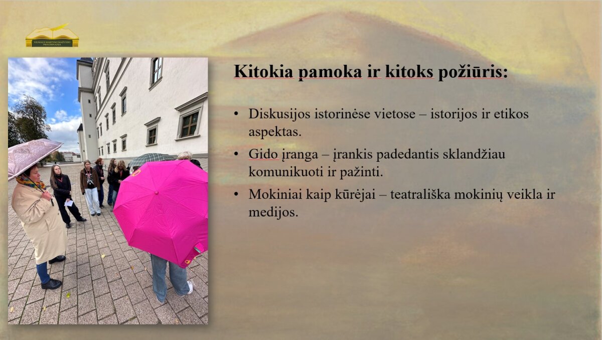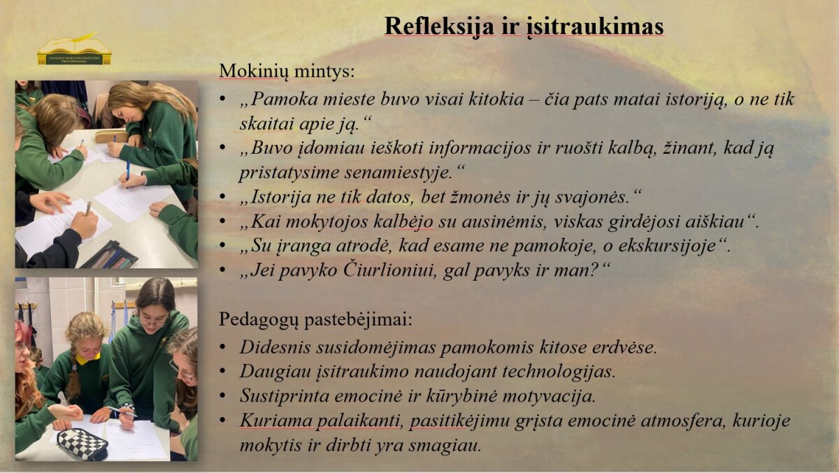 2025-ieji metai Vilniaus Martyno Mažvydo progimnazijos pedagogams buvo ypatingi – jie suteikė galimybę savo darbe taikyti kūrybinius sumanymus, ugdymo veiklas, įkvėptas M. K. Čiurlionio kūrybos, bei dalintis gerąja patirtimi su Lietuvos pedagogais.