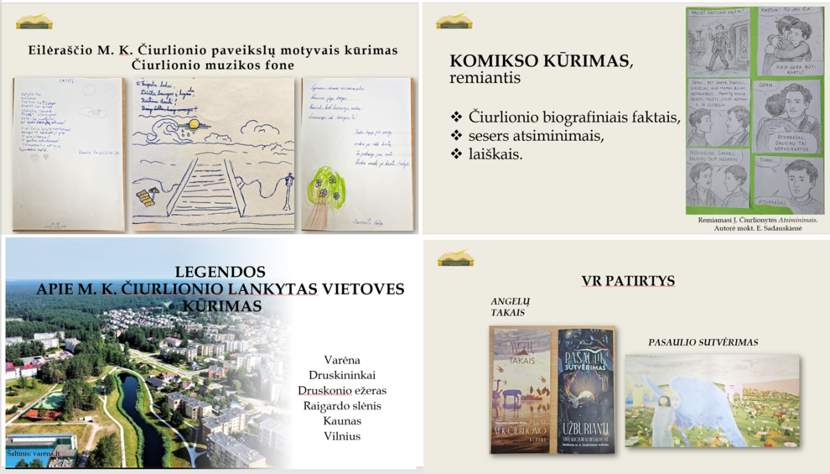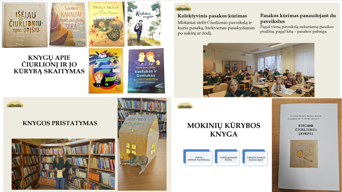 Vilniaus Martyno Mažvydo progimnazija – įvairūs įkvepiantys projektai ir pamokų ciklai: „Pamokų ciklas: piešinių ir pasakų kūrimas M. K. Čiurlionio paveikslo motyvais“, „Pamokų ciklas: tiesiame muzikinius tiltus tarp M. K. Čiurlionio ir šiuolaikinių muzikos stilių“, „Technologijų ir meno sąsajos: M. K. Čiurlionio kūrinių vektorizavimo problemos ir jų galimybės moksleivių gebėjimų ugdymui“, „Čiurlionio šeimos stalo paslaptys“, „Auginame Čiurlionius. RemiXiurlionis“ (integruota muzikos, dailės ir prancūzų kalbos pamoka), „Sapno malūnas. Pilaitės kultūrinis paveldas ir M. K. Čiurlionis“, „M. K. Čiurlionio kūryba lietuvių kalbos ir literatūros pamokose: galimybės ir metodai“, „Čiurlionio pėdsakai Vilniuje“, prancūzų kalbos pamoka M. K. Čiurlionio namuose „Kelionė po Čiurlionio namus“, „Čiurlionio įkvėpti: skaičiais kuriame šventę“ bei „Mikropasaulio ir garsų simfonija gamtos moksluose“.