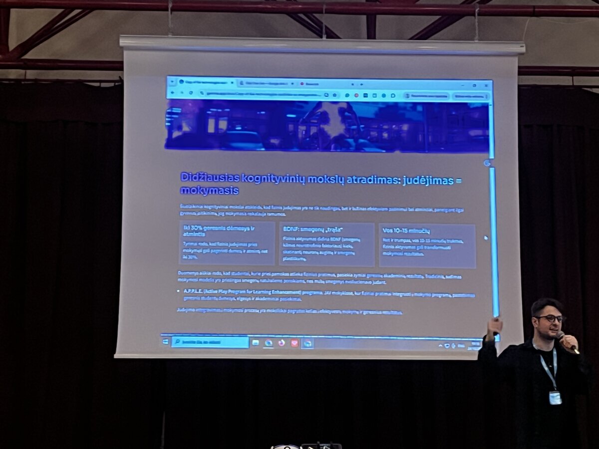 Kristijonas Vasiliauskas akcentavo naujausius kognityvinių mokslų atradimus: mokymosi sėkmė tiesiogiai susijusi su judėjimu („judėjimas = mokymasis“), o mokinių dėmesio išlaikymas ribotas – jų amžius padaugintas iš dviejų. Taip pat aptartos šiuolaikinės problemos, trukdančios vaikų mokymuisi: socialiniai tinklai, informacijos perteklius, miego trūkumas ir stresas. Pristatymo metu dalyviai išbandė išmaniuosius akinius, erdvinius kompiuterius ir kitas inovacijas, padedančias geriau suprasti, kaip technologijos gali sustiprinti ugdymo procesą, o ne jį apsunkinti.