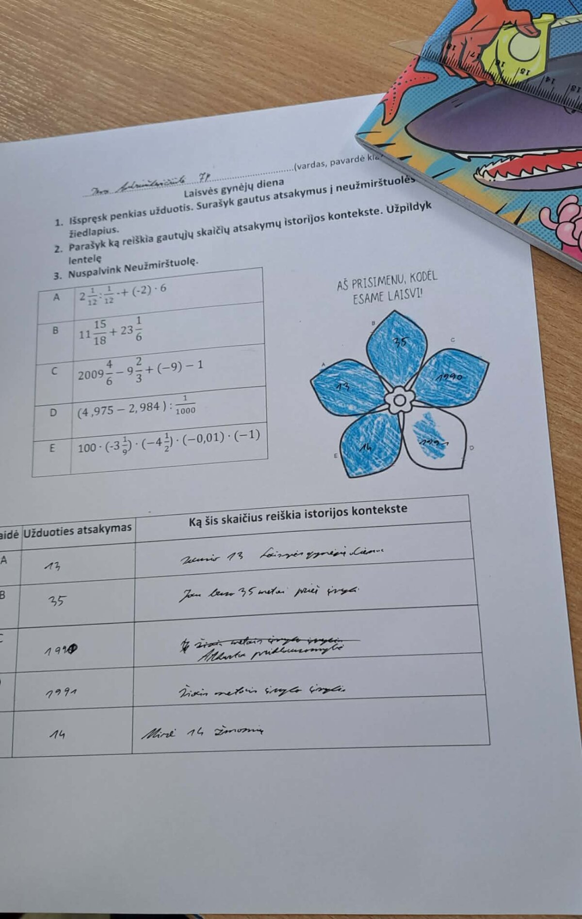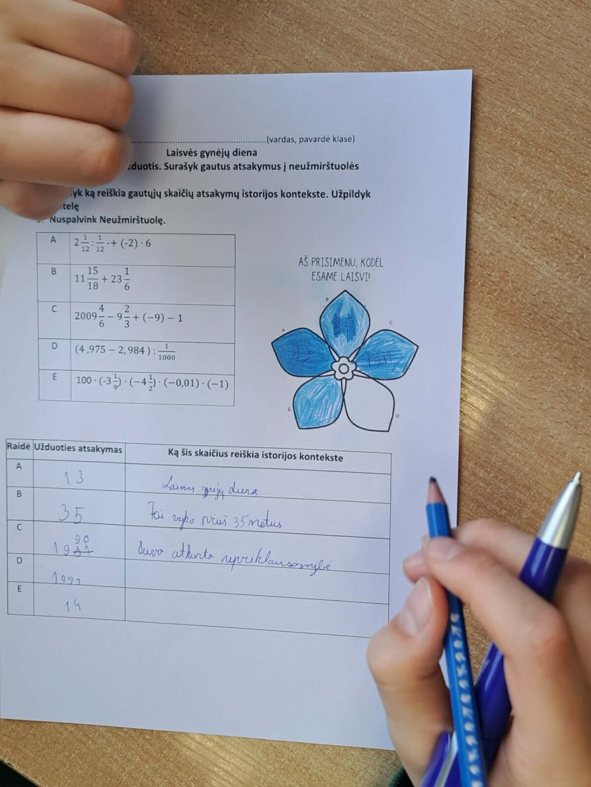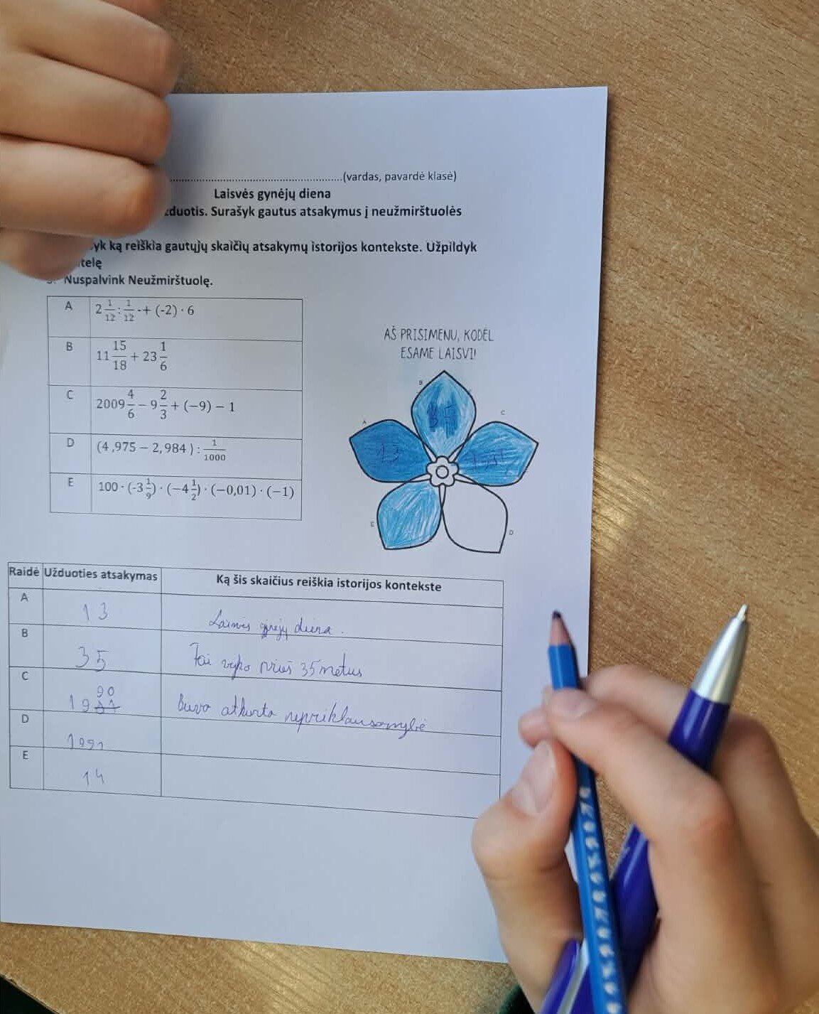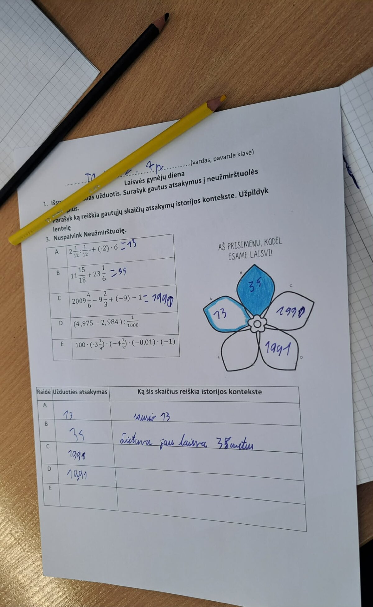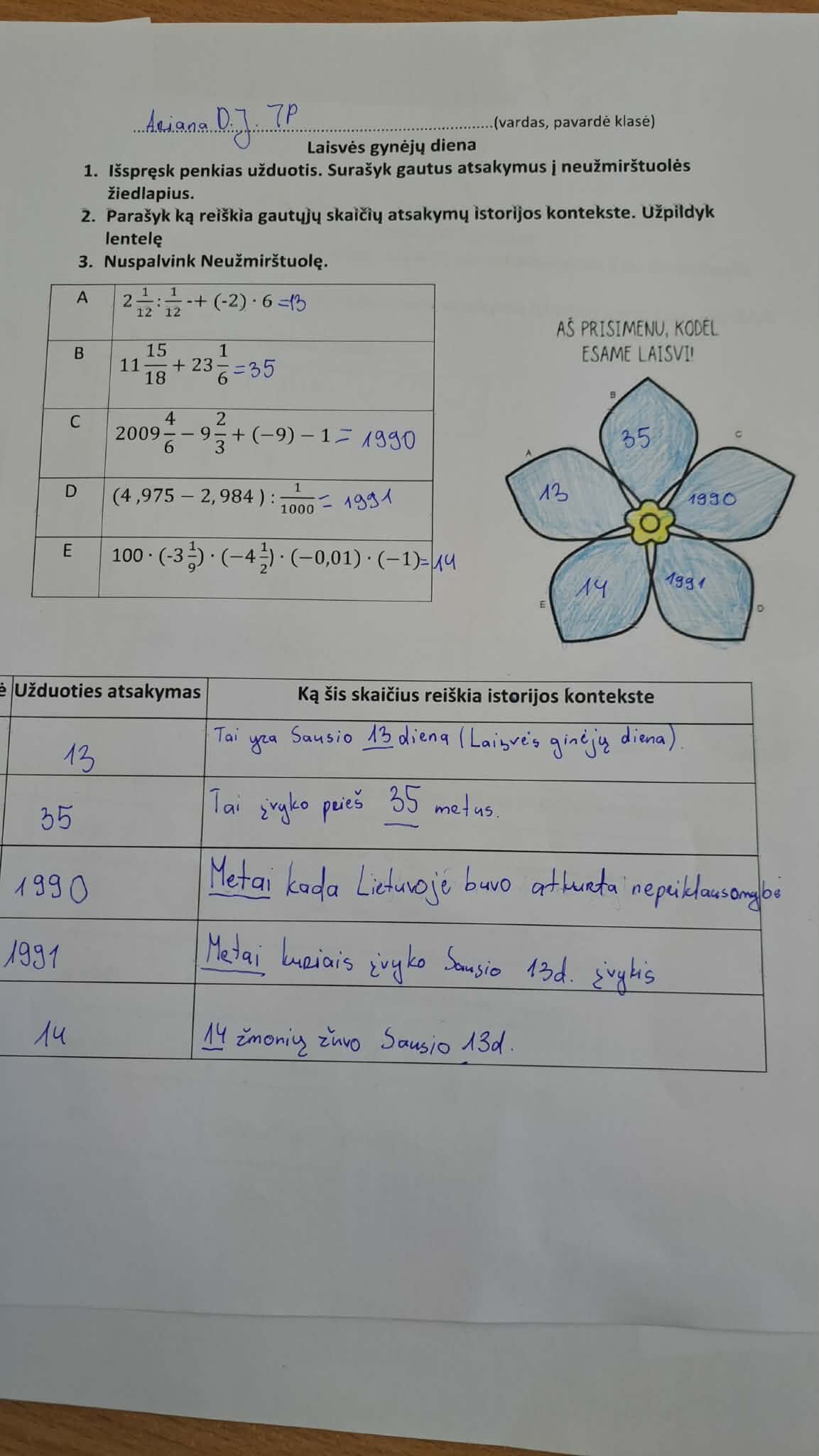 Pamokos metu matematika tapo ne tik skaičiavimo įrankiu, bet ir prasmingu būdu prisiminti svarbius Lietuvos istorijos įvykius. Mokiniai sprendė matematines užduotis, o gautus rezultatus siejo su Sausio 13-osios istoriniais faktais. Atsakymus jie rašė į neužmirštuolės žiedlapius, simbolizuojančius atmintį ir pagarbą Laisvės gynėjams.