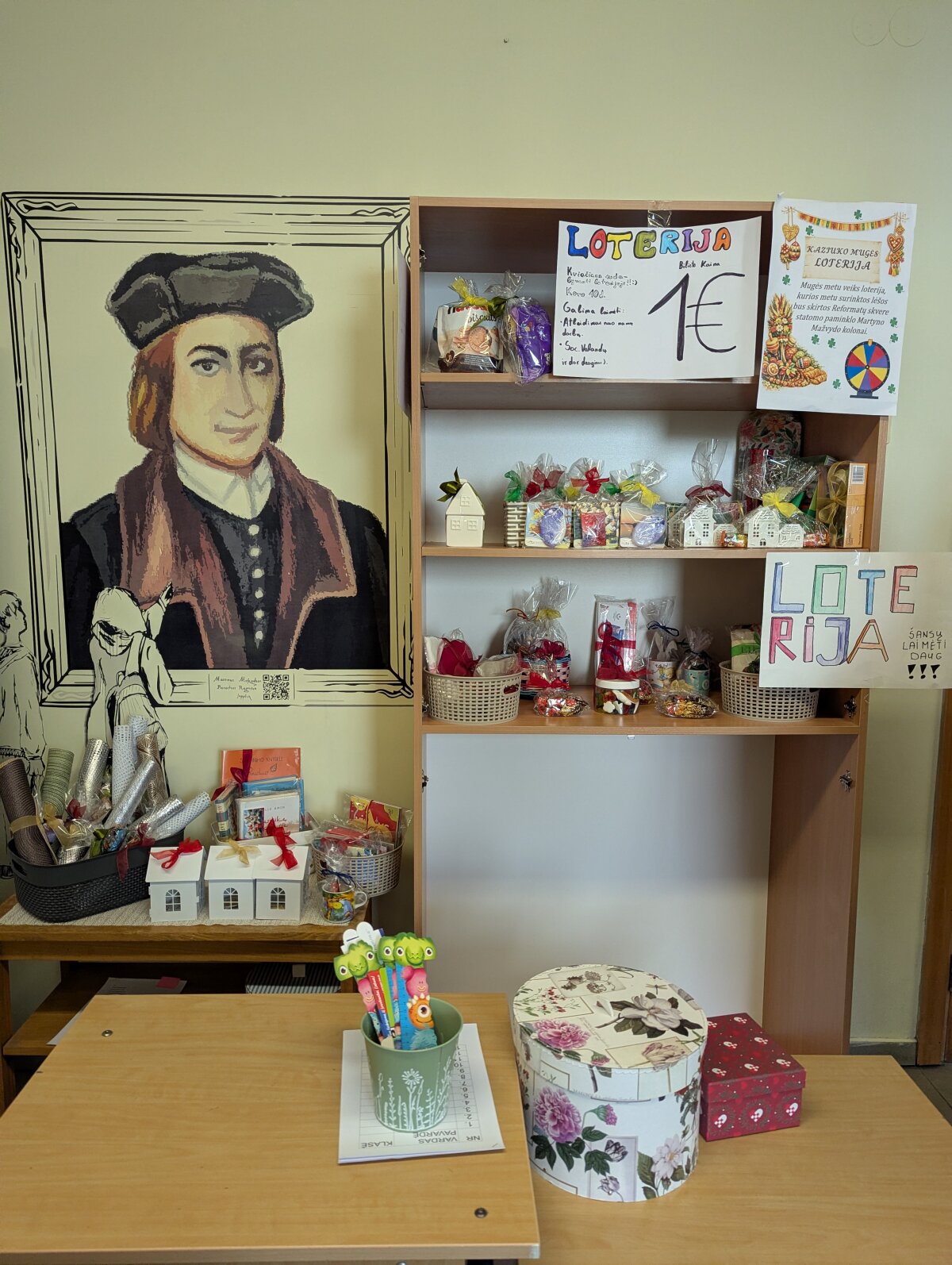 Didelio susidomėjimo sulaukė ir loterija, ypač populiari tarp mokinių. Jos metu surinkti 349 Eur skirti Reformatų skvere statomo paminklo Reformacijai ir lietuviškos raštijos pradininkams – Martyno Mažvydo – kolonai. Taip bendruomenė prisidėjo prie prasmingos iniciatyvos įgyvendinimo. Mugėje taip pat apsilankė LRIK draugijos atstovė, pirmininko pavaduotoja dr. Ina Dagytė Mitutuzienė.