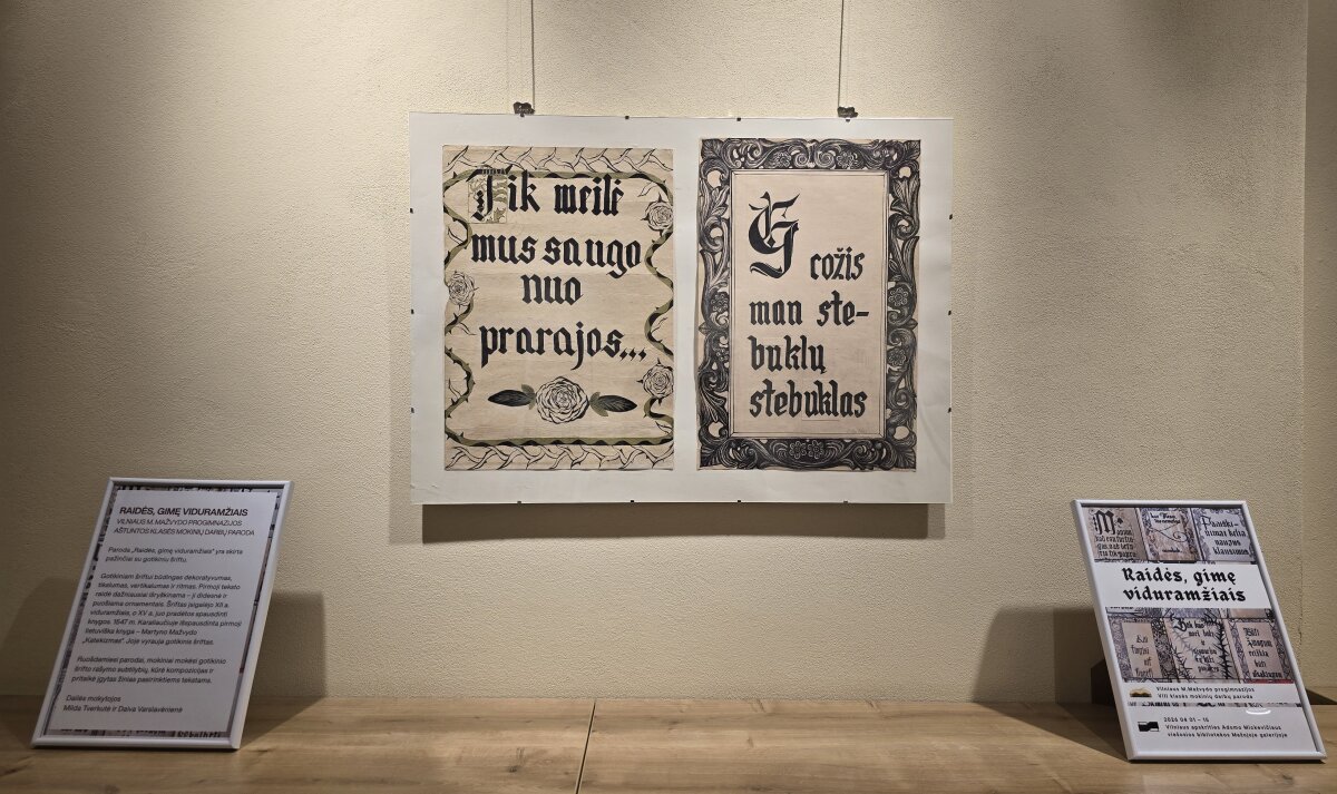 Vilniaus Martyno Mažvydo progimnazijos 8 d klasės mokinių darbų paroda „Raidės, gimę viduramžiais“ nuo 2026 m. balandžio 1 d. eksponuojama Vilniaus apskrities Adomo Mickevičiaus viešojoje bibliotekoje.