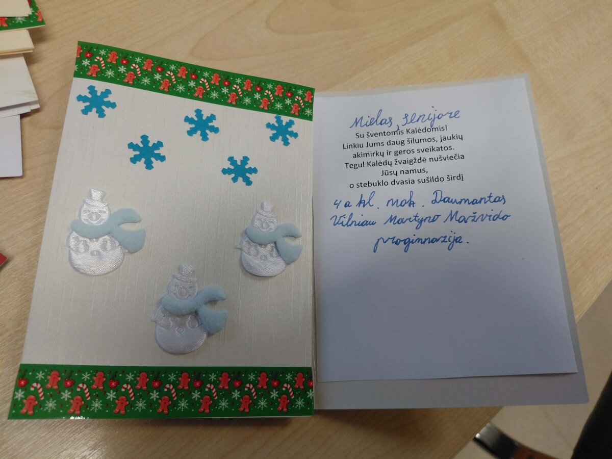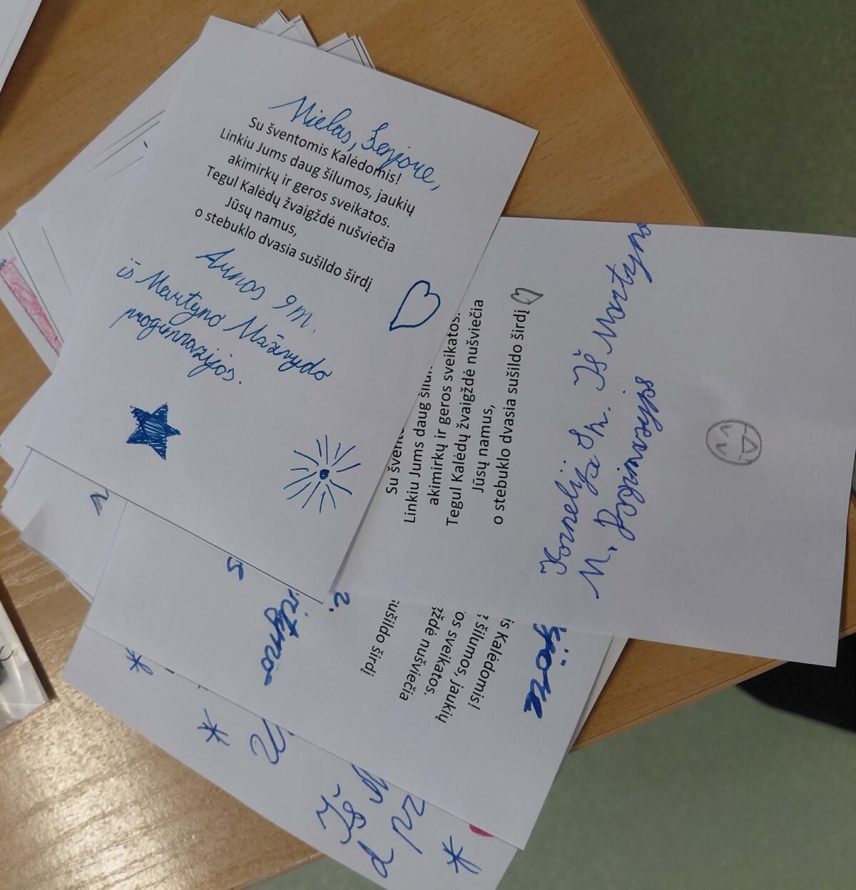 Vilniaus Martyno Mažvydo progimnazijoje jau tradicija tapo prasminga akcija „Laiškai senjorams“, vykusi 2025 m. gruodžio 8–19 dienomis. Į šią gražią iniciatyvą įsitraukė 1–8 klasių mokiniai, dovanoję senjorams ne tik atvirukus, bet ir nuoširdų dėmesį.
