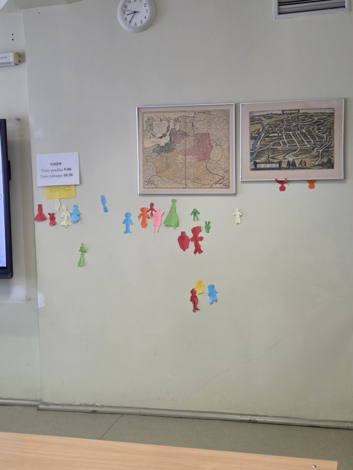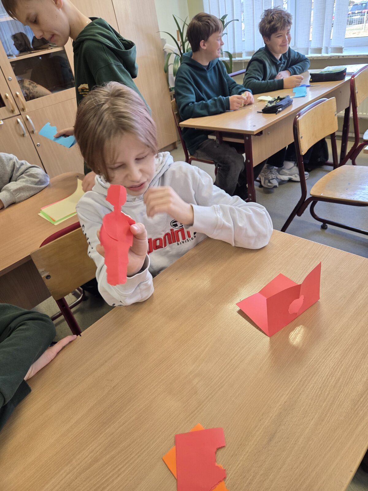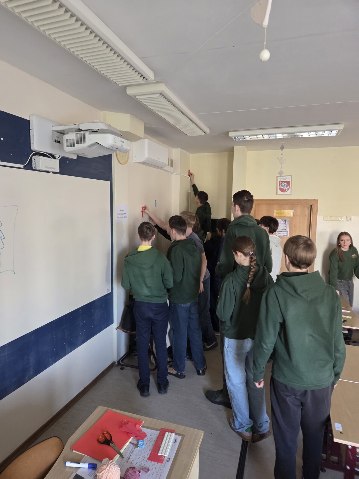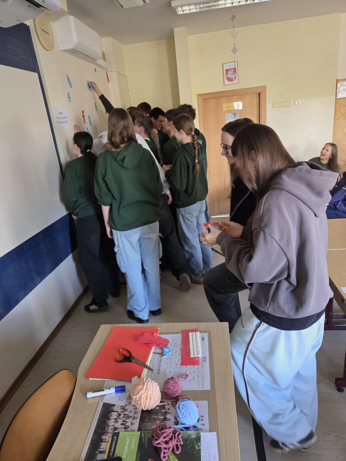 Vėliau mokiniai atliko kūrybinę praktinę užduotį – iš spalvoto popieriaus plėšė savo „žmogeliukus“, simbolizuojančius juos pačius, ir klijavo juos ant sienos. Taip susiformavo savotiškas klasės bendravimo žemėlapis, kuriame atsiskleidė tarpusavio santykiai.