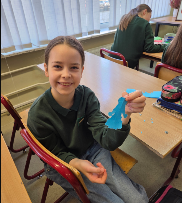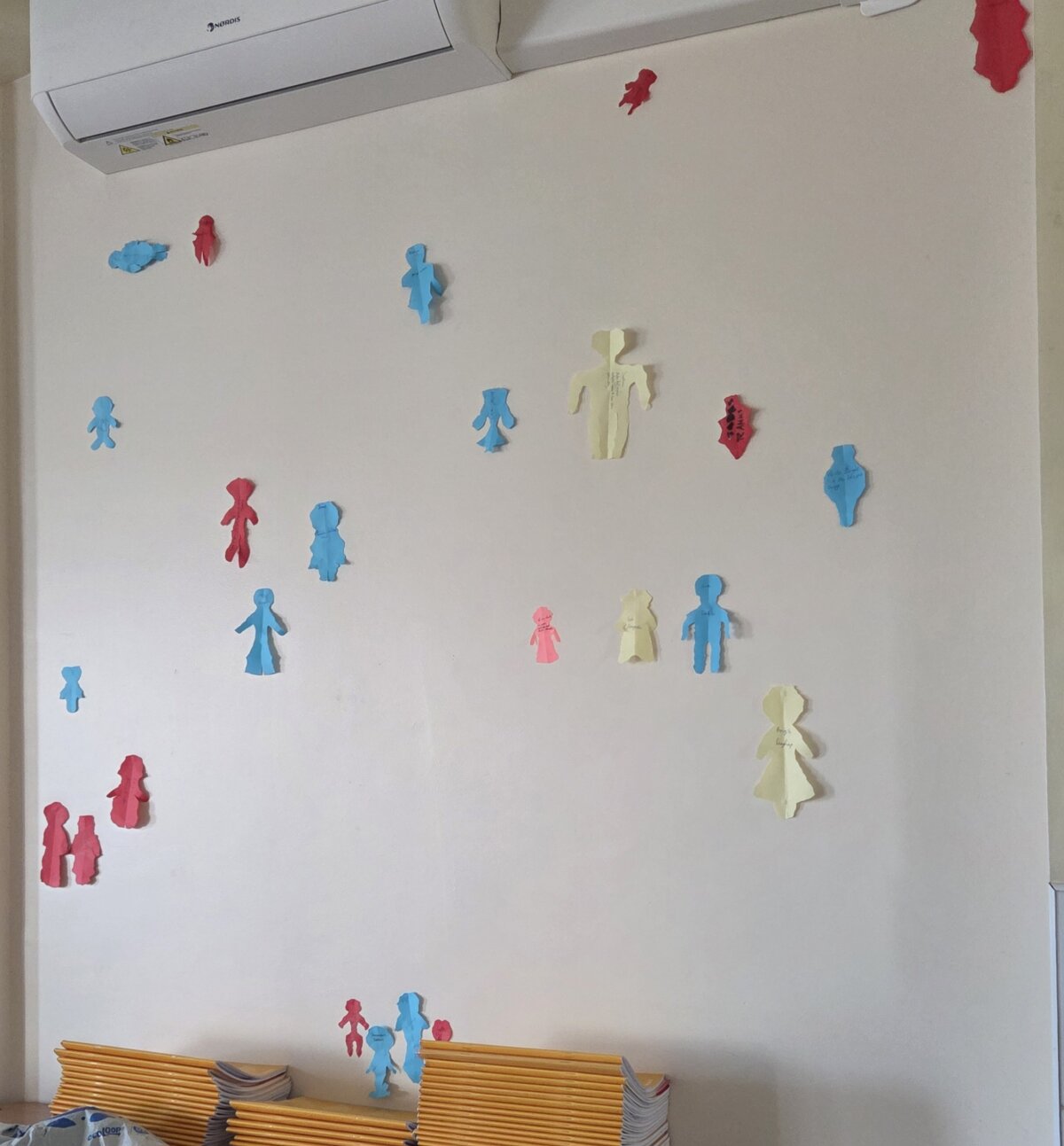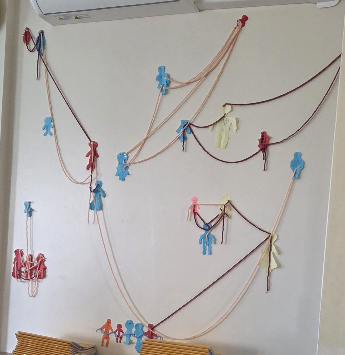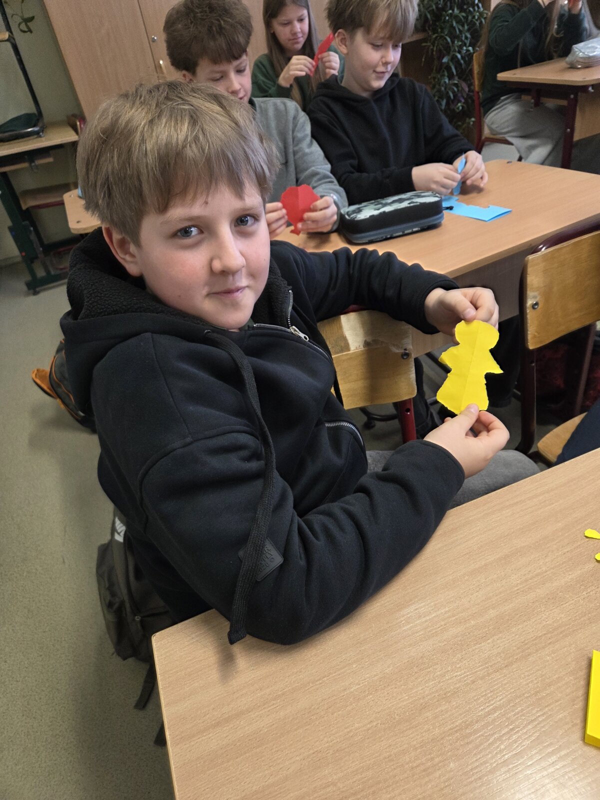 Vėliau mokiniai atliko kūrybinę praktinę užduotį – iš spalvoto popieriaus plėšė savo „žmogeliukus“, simbolizuojančius juos pačius, ir klijavo juos ant sienos. Taip susiformavo savotiškas klasės bendravimo žemėlapis, kuriame atsiskleidė tarpusavio santykiai.